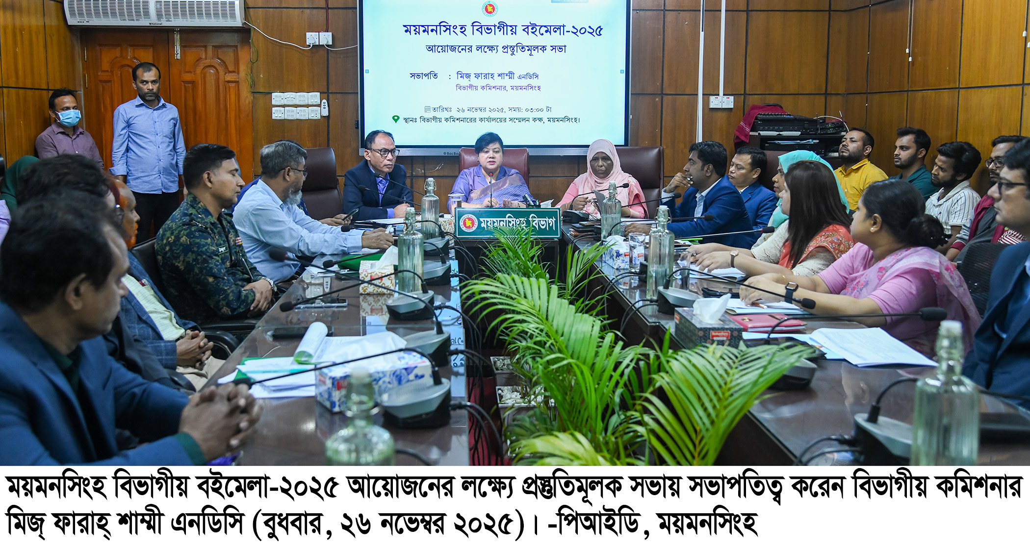 ময়মনসিংহ বিভাগীয় বইমেলা-২০২৫ আয়োজন উপলক্ষ্যে বুধবার (২৬ নভেম্বর) বিকেলে প্রস্তুতিমূলক সভা অনুষ্ঠিত হয়েছে। ময়মনসিংহ বিভাগীয় কমিশনারের কার্যালয়ের সম্মেলন কক্ষে কার্যালয়ের আয়োজনে এ সভা অনুষ্ঠিত হয়। সভায় সভাপতিত্ব করেন ময়মনসিংহ বিভাগীয় কমিশনার ফারাহ শাম্মী।