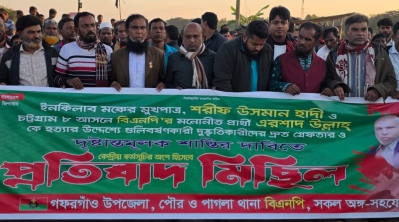 ওসমান হাদিকে গুলি করার প্রতিবাদে গফরগাঁওয়ে বিএনপির বিক্ষোভ মিছিল