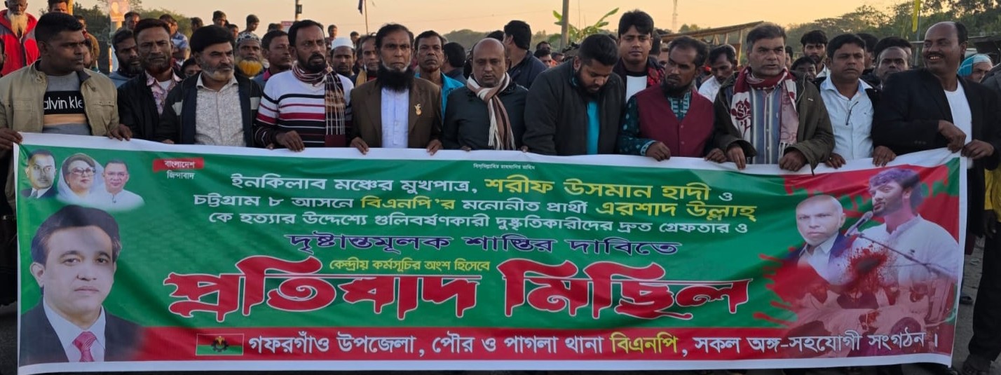 ওসমান হাদিকে গুলি করার প্রতিবাদে গফরগাঁওয়ে বিএনপির বিক্ষোভ মিছিল