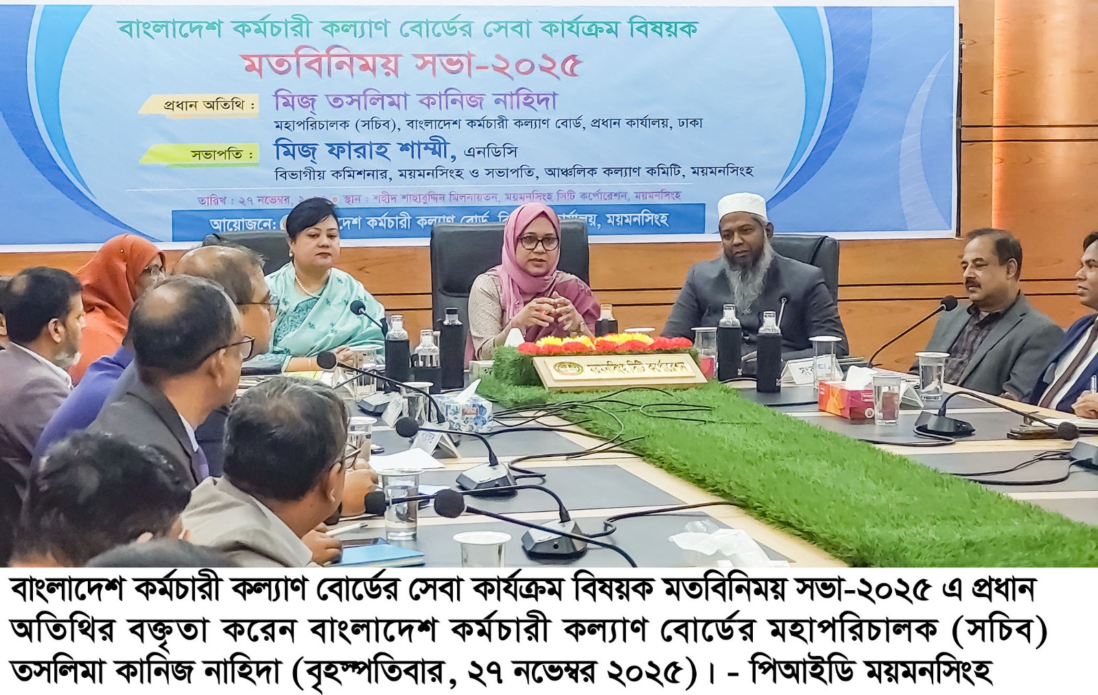 বাংলাদেশ কর্মচারী কল্যাণ বোর্ডের মহাপরিচালক (সচিব) তাসলিমা কানিজ নাহিদা বলেছেন, কল্যাণ বোর্ডকে একটি আয়বর্ধক ও কার্যকর প্রতিষ্ঠান হিসেবে গড়ে তুলতে হবে। কর্মচারীদের দক্ষতা বৃদ্ধির জন্য প্রশিক্ষণ এবং বোর্ডের প্রশাসনিক ও আর্থিক সক্ষমতা বাড়ানো জরুরি। আমরা ইতোমধ্যে কল্যাণ কর্মকর্তাদের কার্যক্রমকে সক্রিয় করেছি এবং সরকারি কর্মচারীদের জন্য সব বিভাগে আঞ্চলিক কর্মচারী হাসপাতাল প্রতিষ্ঠার কার্যক্রম চলছে। বৃহস্পতিবার (২৭ নভেম্বর) ময়মনসিংহ সিটি কর্পোরেশনের শহীদ শাহাবুদ্দিন মিলনায়তনে বাংলাদেশ কর্মচারী কল্যাণ বোর্ড, বিভাগীয় কার্যালয় কতৃক আয়োজিত বাংলাদেশ কর্মচারী কল্যাণ বোর্ডের সেবা কার্যক্রম বিষয়ক মতবিনিময় সভায় প্রধান অতিথির বক্তৃতায় তিনি এসব কথা বলেন।