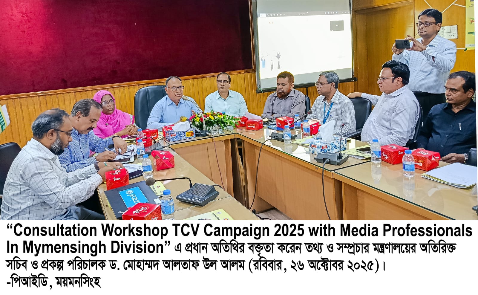 রবিবার সকালে ময়মনসিংহ জেলা পরিষদের শিল্পাচার্য জয়নুল আবেদীন মিলনায়তনে জাতীয় গণমাধ্যম ইনস্টিটিউট আয়োজিত ‘ডিভিশনাল লেভেল কনসাল্টেশন ওয়ার্কশপ অন টিসিভি ভ্যাকসিনেশন ক্যাম্পেইন ২০২৫ উইথ মিডিয়া পিপল’ শীর্ষক কর্মশালায় প্রধান অতিথির বক্তৃতায় অতিরিক্ত সচিব এসব কথা বলেন। গণমাধ্যমকর্মীসহ প্রায় অর্ধশতাধিকের বেশি অংশগ্রহণকারী এ কর্মশালায় অংশগ্রহণ করেন।
