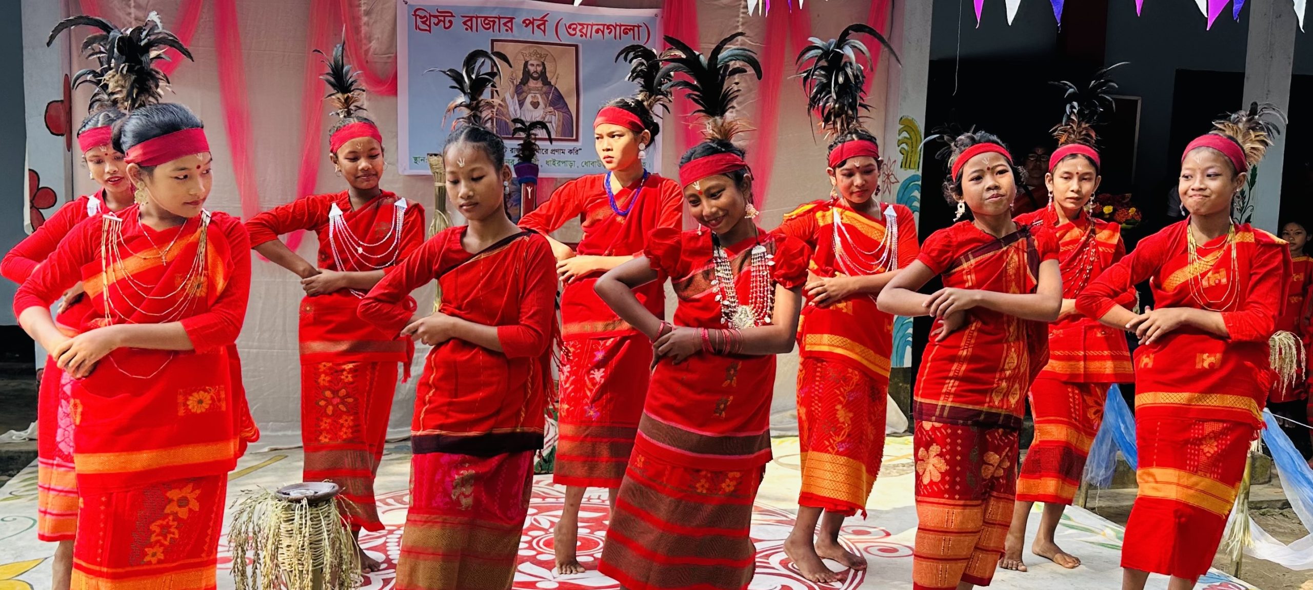 গারো তরুণীরা নেচে গেয়ে উৎসবমূখর পরিবেশে ওয়ানগালা উৎসব উদযাপন করেন।