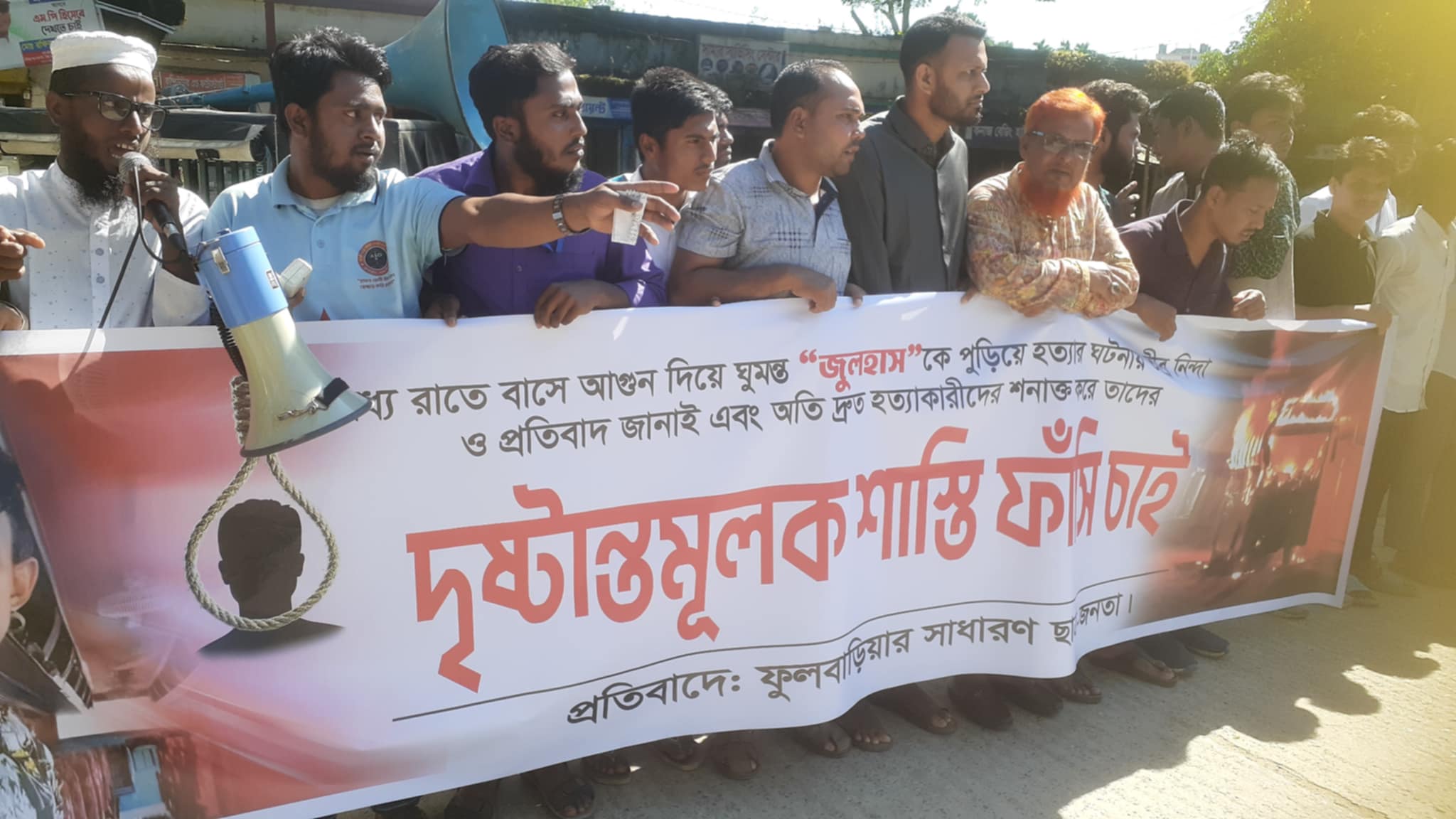 ফুলবাড়িয়া (ময়মনসিংহ) প্রতিনিধি: ময়মনসিংহের ফুলবাড়িয়ার ভালুকজান তেলের পাম্প এলাকায় আলম এশিয়া প্রা.লি.পরিবহনের বাসে দুর্বৃত্তদের দেয়া আগুনে ঘুমন্ত থাকা চালক জুলহাসের মর্মান্তিক মৃত্যুর ঘটনার প্রতিবাদে মানববন্ধন অনুষ্ঠিত হয়েছে।
