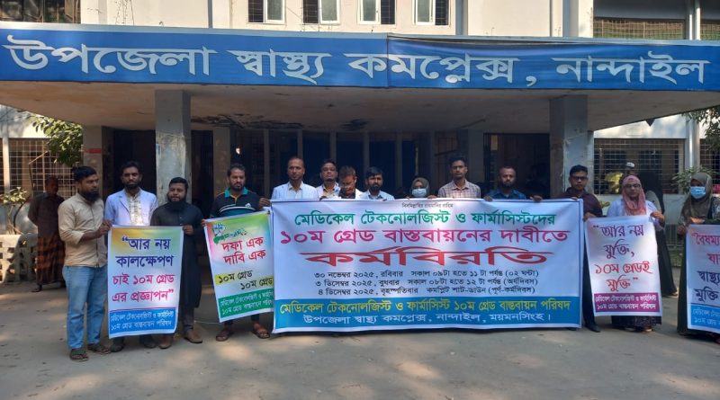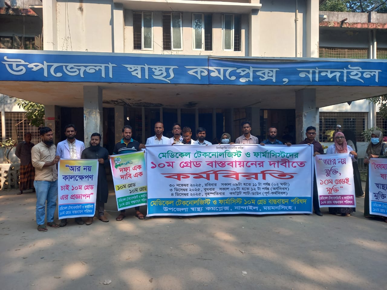 কর্মবিরতি চলার সময় বক্তব্য রাখেন নান্দাইল উপজেলা স্বাস্থ্য কমপ্লেক্সের মেডিকেল টেনলোজিস্ট আল আমিন, মেডিকেল টেনলোজিস্ট (রেডিওলজি এন্ড ইমোজিং) জুলফিকার আলী হায়দার, ফার্মাসিস্ট আতিকুর রহমান প্রমুখ।