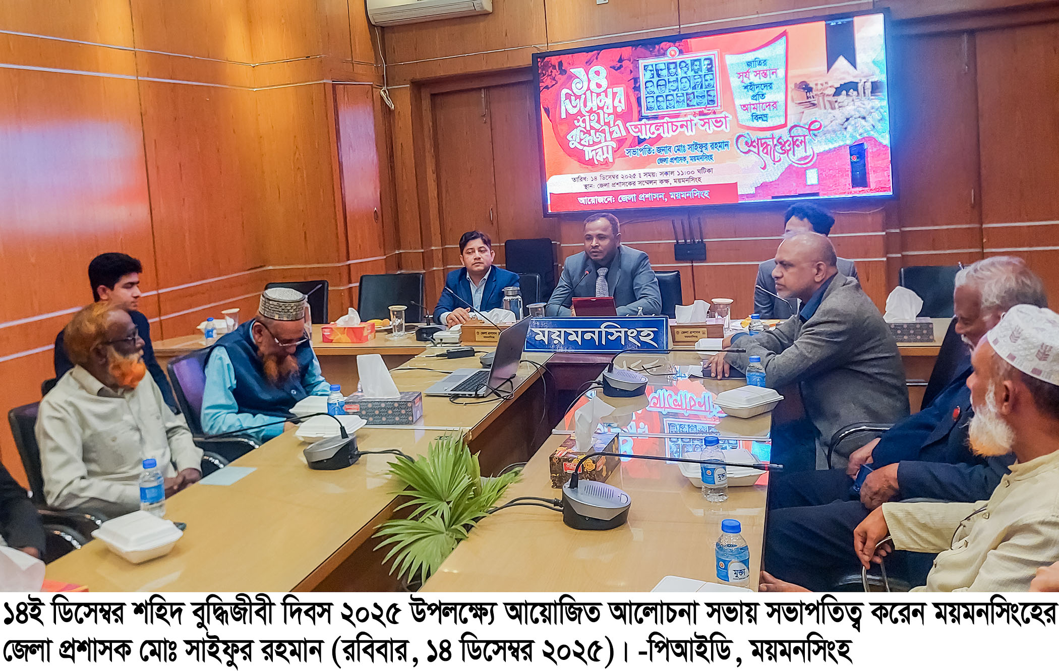 শহীদ বুদ্ধিজীবী দিবস উপলক্ষ্যে ময়মনসিংহে আলোচনা সভা অনুষ্ঠিত হয়। ময়মনসিংহ জেলা প্রশাসনের আয়োজনে রবিবার (১৪ ডিসেম্বর) কার্যালয়ের সম্মেলন কক্ষে এ আলোচনা সভা অনুষ্ঠিত হয়। আলোচনা সভায় সভাপতি হিসেবে উপস্থিত ছিলেন ময়মনসিংহ জেলা প্রশাসক মোঃ সাইফুর রহমান।