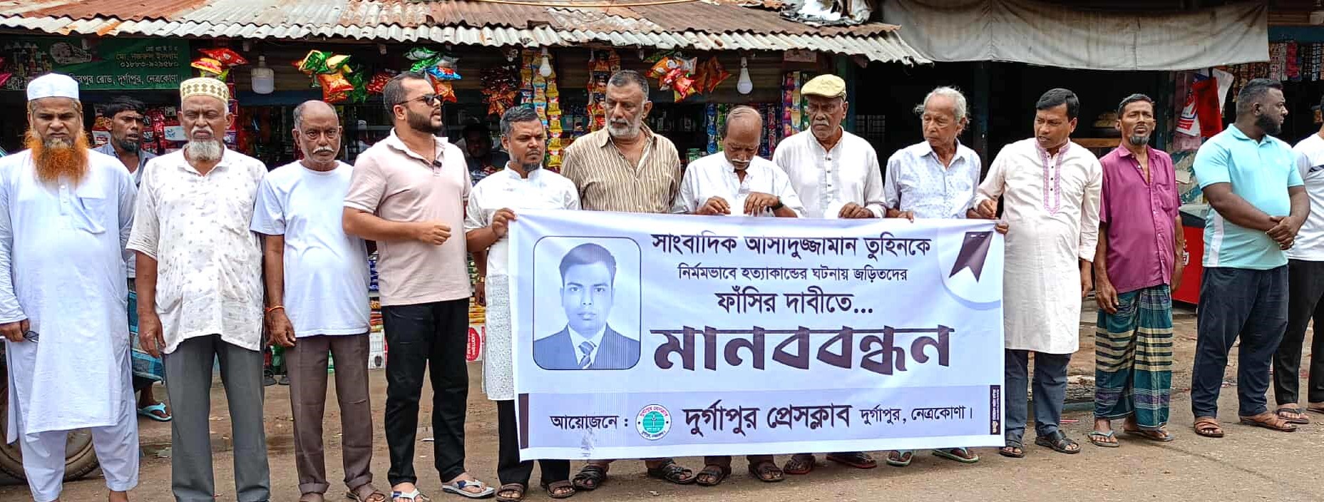 রাখী দ্রং ,দুর্গাপুর ( নেত্রকোনা ) প্রতিনিধি : গাজীপুরে প্রকাশ্যে সাংবাদিক আসাদুজ্জামান তুহিন কে হত্যাকারীদের দৃষ্টান্তমূলক শাস্তি ও ফাঁসির দাবীতে নেত্রকোনার দুর্গাপুর প্রেসক্লাব সাংবাদিকদের মানববন্ধন কর্মসূচি পালিত হয়েছে। রবিবার (১০ আগস্ট) বেলা ১২টায় দুর্গাপুর প্রেসক্লাবের উদ্যোগে পৌর শহরের প্রেসক্লাব মোড়ে এই মানববন্ধন অনুষ্ঠিত হয়।