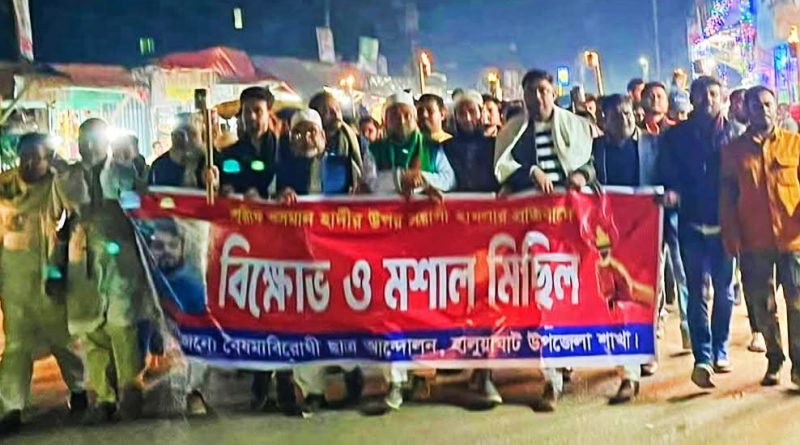 হাদীর উপর সন্ত্রাসী হামলার প্রতিবাদে হালুয়াঘাটে বিক্ষোভ ও মশাল মিছিল