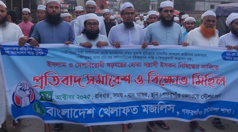 Read Moreরফিকুল ইসলাম খান, গফরগাঁও প্রতিনিধিঃ বাংলাদেশ খেলাফত মজলিস গফরগাঁও উপজেলা শাখার উদ্যোগে রোববার (২৬ অক্টোবর) ইসকন নিষিদ্ধের দাবিতে এক বিক্ষোভ
